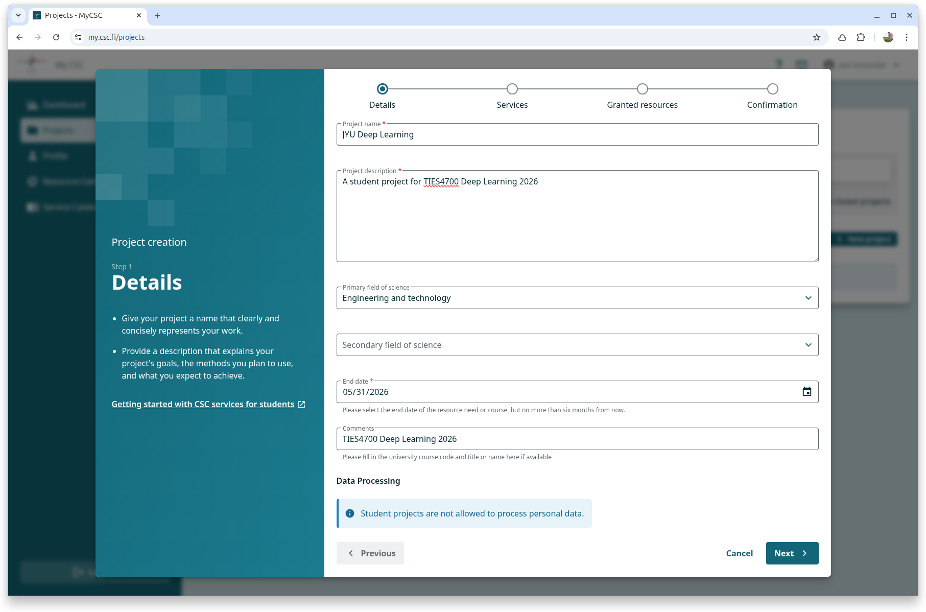 After creation, your project will have a number like project_2001234. You can always find this number by logging into MyCSC. You will need this number frequently (e.g., for sbatch --account=project_...), so keep it handy!