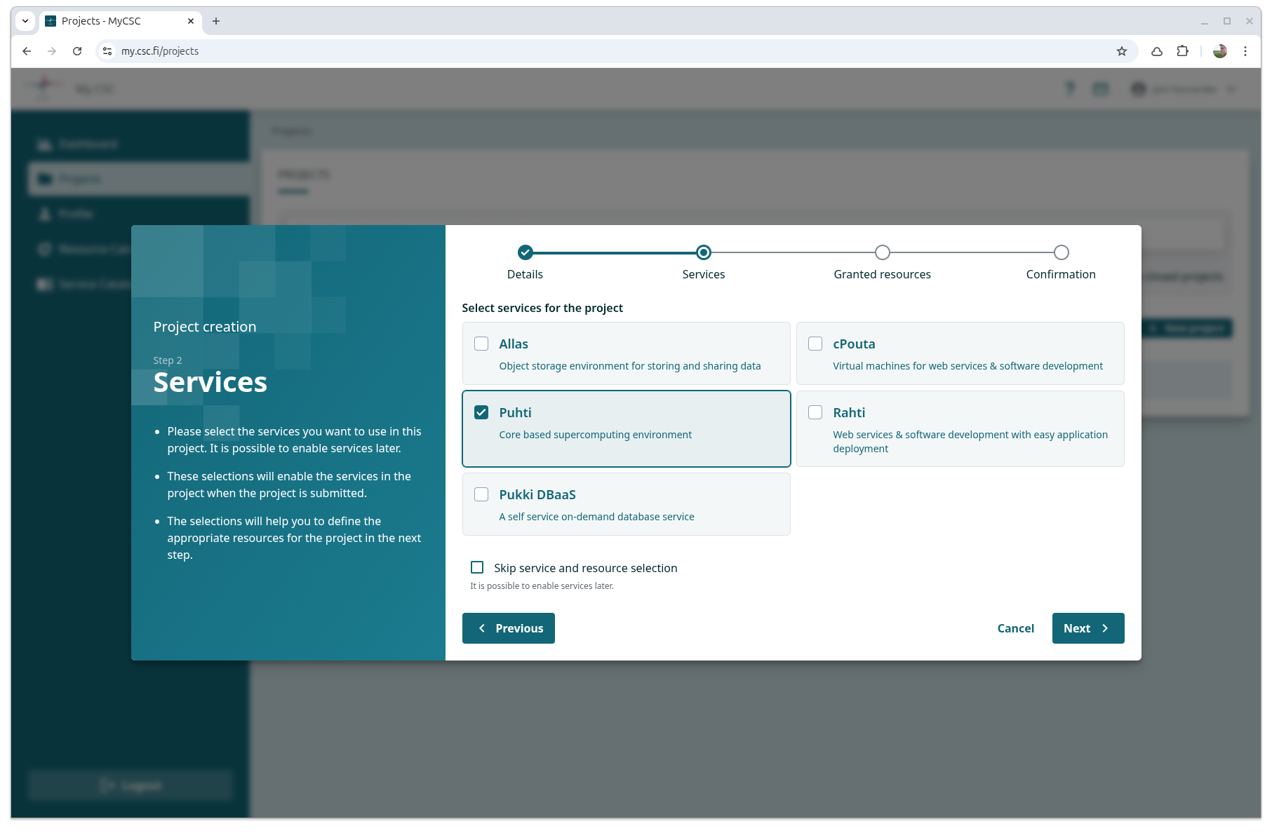 Assuming you have created your CSC account and have access to MyCSC, you can create a project by following the steps below:
