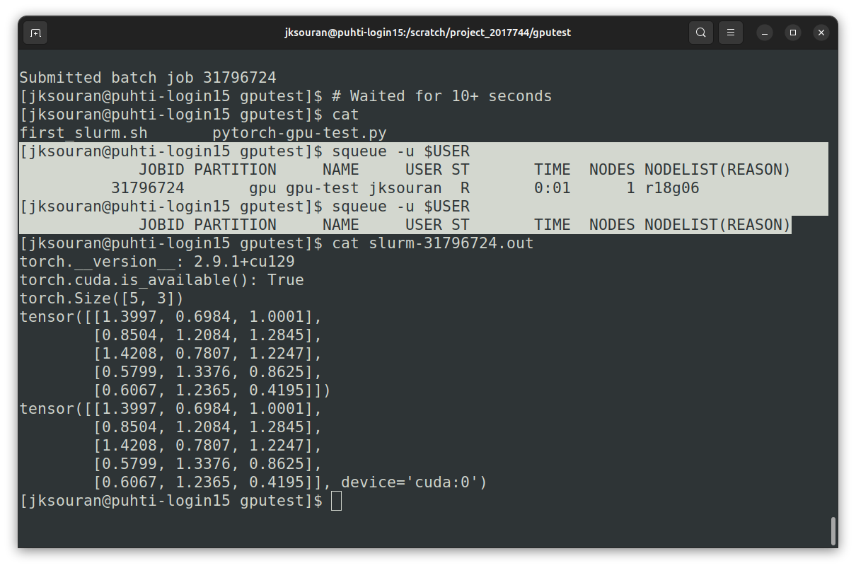To verify GPU access, we will use an example script from CSC's repository. This script, pytorch-gpu-test.py, verifies that PyTorch can see and use the GPU.