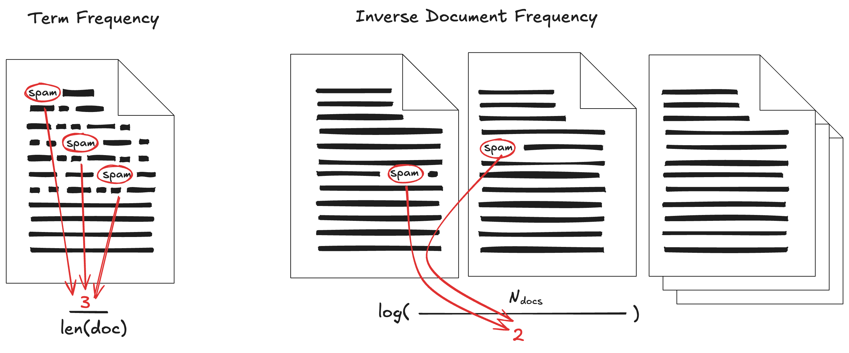 Tämän luvun viimeinen aihe, TF-IDF (Term Frequency Inverse Document Frequency) on hieman monimutkaisempi kuin aiemmat, mutta ei silti varsinaista rakettitiedettä. TF-IDF muuttaa tekstin numeeriseen vektorimuotoon, jossa jokainen sarake vastaa sanaa ja jokainen rivi dokumenttia. Alla oleva Kuva 1, jossa esitellään TF ja IDF erikseen, on toivon mukaan intuition tasolla selkeä.