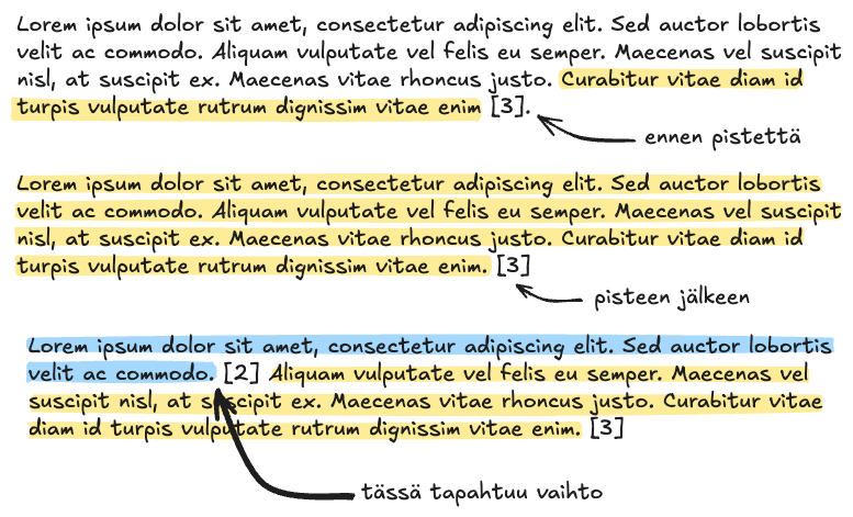 Kuvio 2: Se, onko lähdeviite ennen vai jälkeen virkkeen päättävän pisteen, on tärkeää. Kuviossa keltainen taustaväri tarkoittaa, että lause perustuu lähteeseen numero 3. Sinertävä väri tarkoittaa, että lause perustuu lähteeseen numero 2. Taustaväritön teksti olisi sinun omaan päättelyysi perustuvaa.