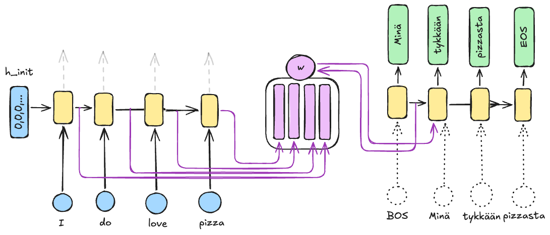 Kuva 1: Kuvassa näkyy vasemmalla enkooderi-RNN ja oikealla dekooderi-RNN. Näiden välissä on attention-mekanismi, joka saa syötteenä kaikkien aika-askeleiden piilotetut tilat. Kullekin dekooderin aika-askeleelle lasketaan kohdistuspisteet (alignment scores), jotka kuvaavat sitä, kuinka hyvin dekooderin nykyinen tila vastaa kutakin enkooderin tilaa. Kohdistuspisteet voidaan laskea monella tavalla, joista yksi on pistetulo (dot product). Kosinisamankaltaisuus saadaan pistetulosta, jos vektorit normalisoidaan. 5