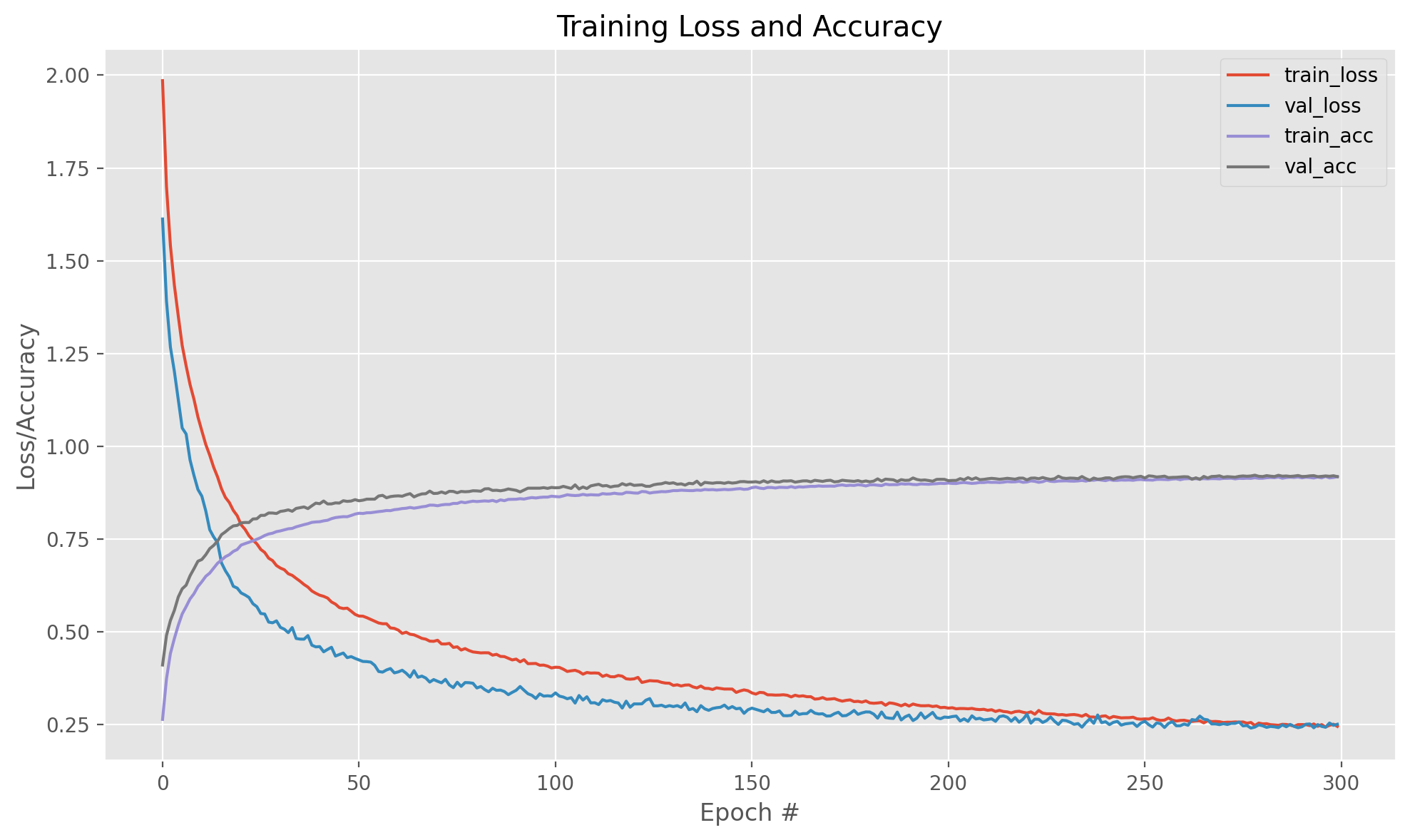 Kuva 2: 300 epookin koulutuksen aikaiset tarkkuus- ja virhekäyrät Grahamin Fractional Max-Pooling -mallille (12M parametria).