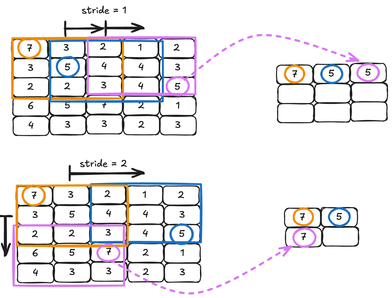 Kuva 9: Max-pooling toteutettuna 5x5 taulukkoa vasten. Suotimen koko on 3x3. Ylemmässä esimerkissä askel on 1, alemmassa askel on 2. Kummassakin tapauksessa on esitelty kolme ensimmäistä askelta.