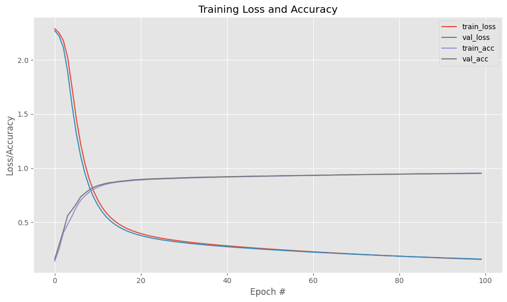 Kuvaajan vaakasuuntainen akseli on epookkien määrä. Kuvan koulutuksessa on ajettu 100 epookkia. Yksi epookki tarkoittaa, että koko koulutusdata on käyty läpi kerran. Koska koulutusdata on jaettu pienempiin eriin (batch), yksi epookki koostuu useammasta batchista. Tässä tapauksessa batch-koko on 128, joten yhdessä epookissa on \(60000 / 128 \approx 469\) askelta (batches). Malli päivittää painojaan jokaisen batchin jälkeen.