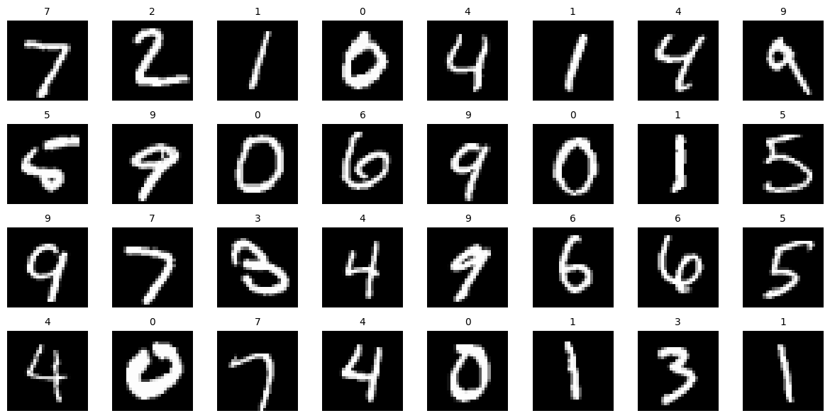 MNIST-datassa on käsinkirjoitettuja numeroita (0-9), jotka on skaalattu 28x28 pikselin harmaasävykuviksi. Kuvat on esitetty alla olevassa kuvassa. PyTorchin MNNIST tarjoaa 60 000 koulutuskuvaa ja 10 000 testikuvaa. Kuvat ovat tavallisia yksikanavaisia harmaasävykuvia PIL-formaatissa eli niiden pikseliarvot ovat välillä 0-255